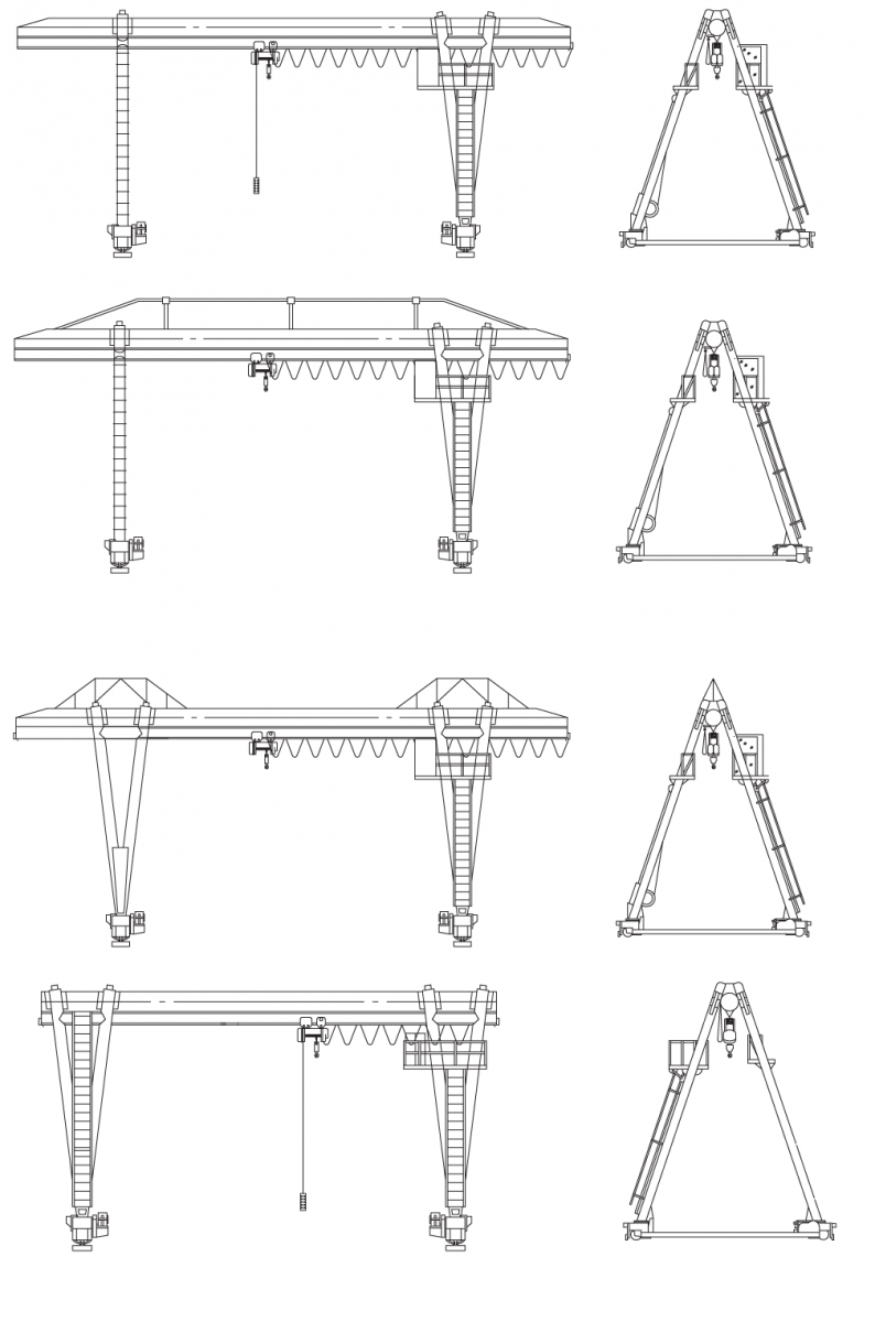 Козловые краны выпускаются различной грузоподъемности от 3,2 т. до 32 т. На железных дорогах и морских портах, широкое применение получили козловые краны – контейнерные перегружатели. Если обычные краны оборудованы крюком, то данные краны оборудованы съемным накладным приспособлением с 4-мя кулачковыми запорными механизмами.Для организации работ с сыпучими грузами, применяются краны оборудованные грейфером, а так же различными траверсами.